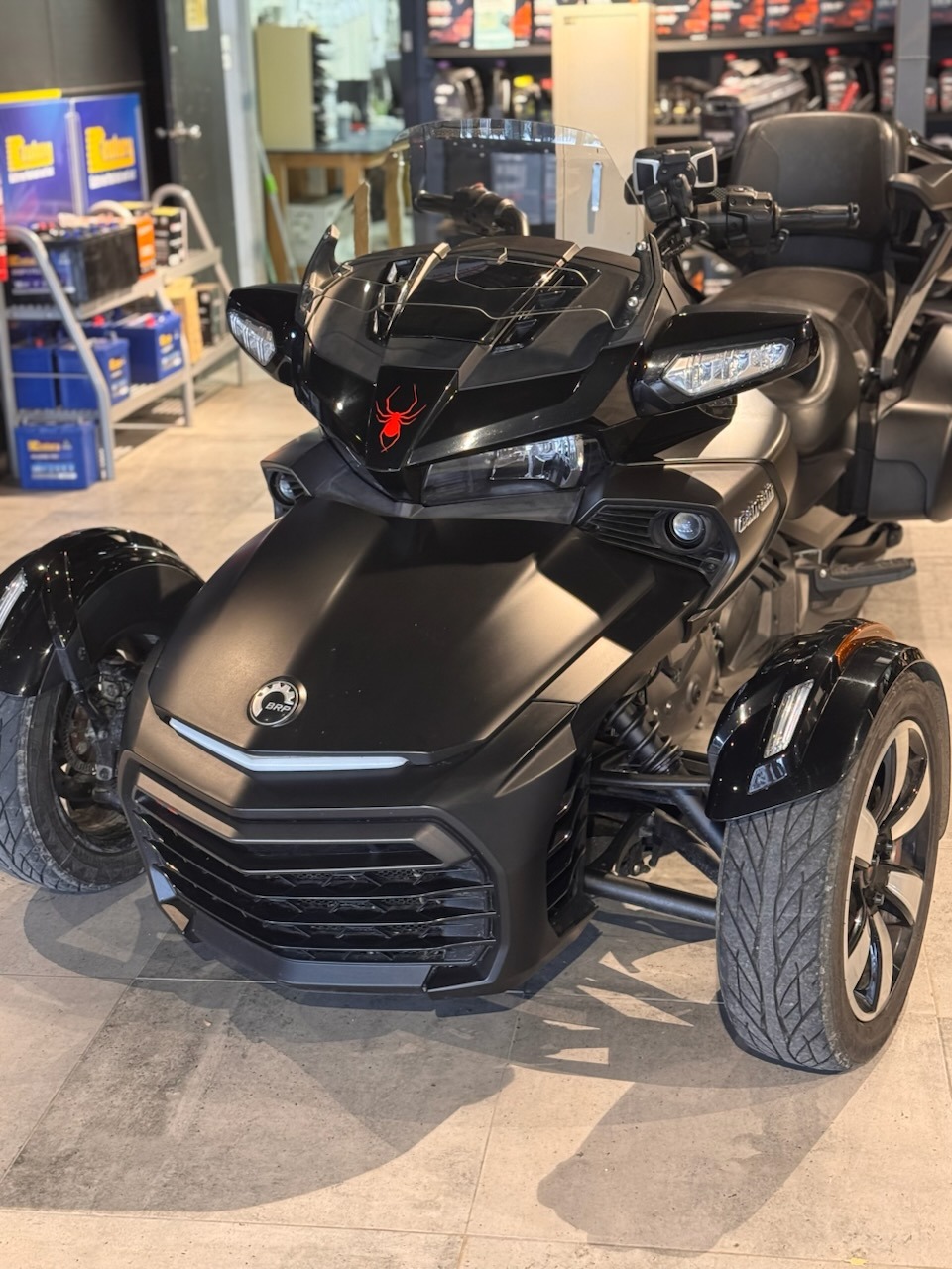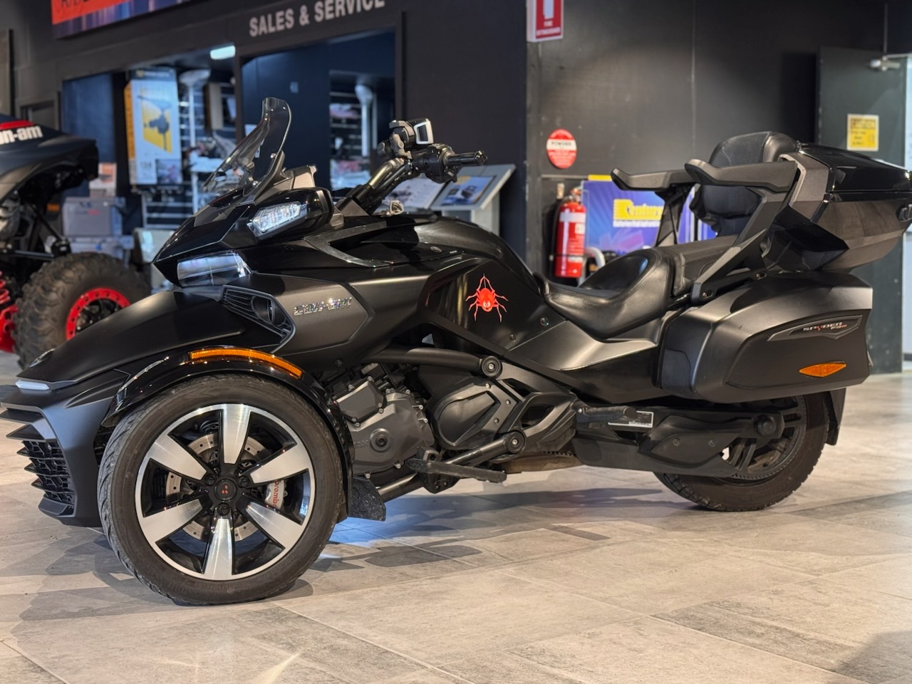 This 2017 Can-Am Spyder F3-T is a "bagger" style three-wheeler designed for comfortable touring, featuring integrated saddlebags, a rear top box with passenger arm rests, a windshield and a 1330cc Rotax engine. It blends sporty handling with long-distance comfort, featuring the UFit system for customizable footpeg and handlebar positions.