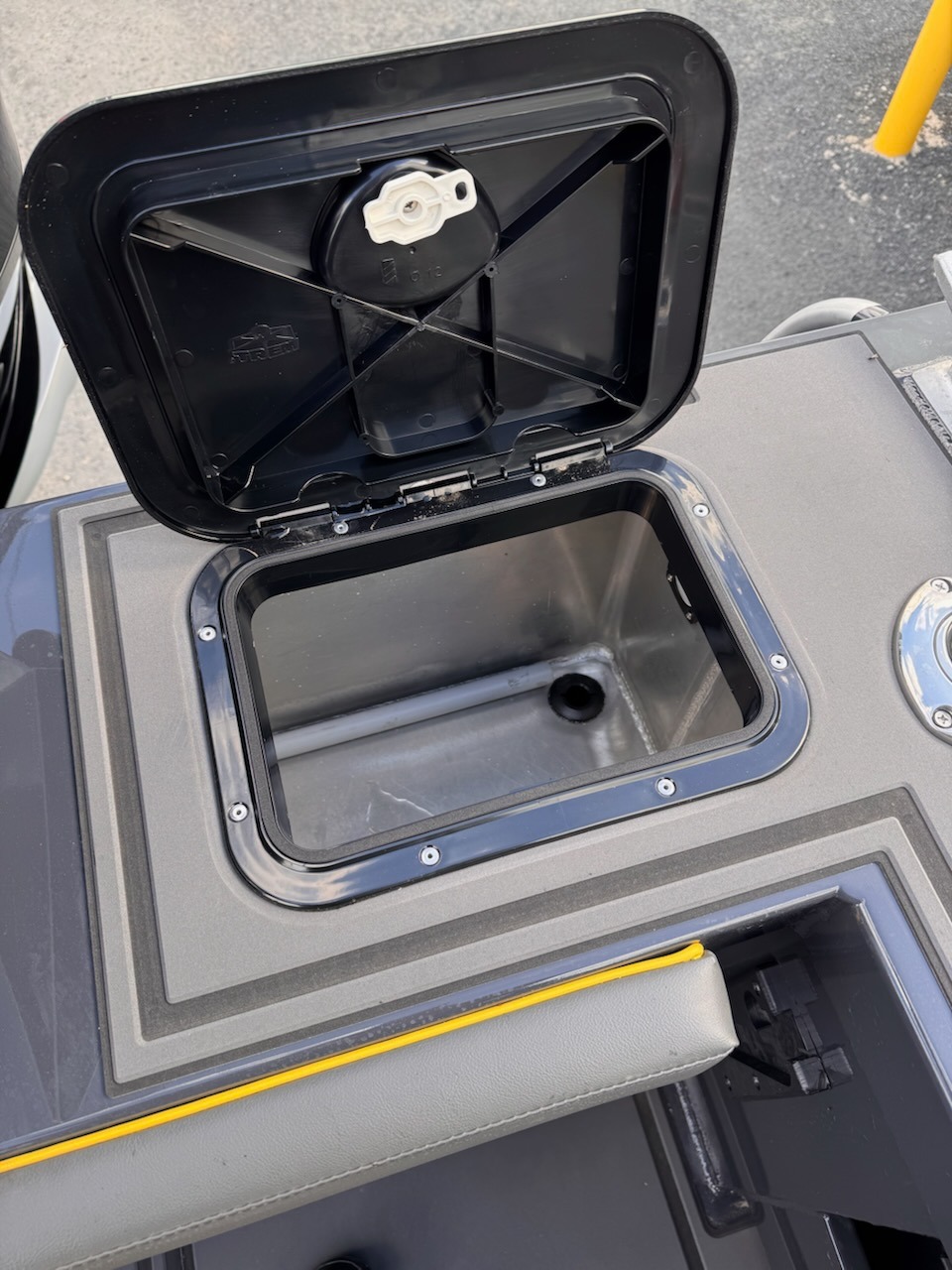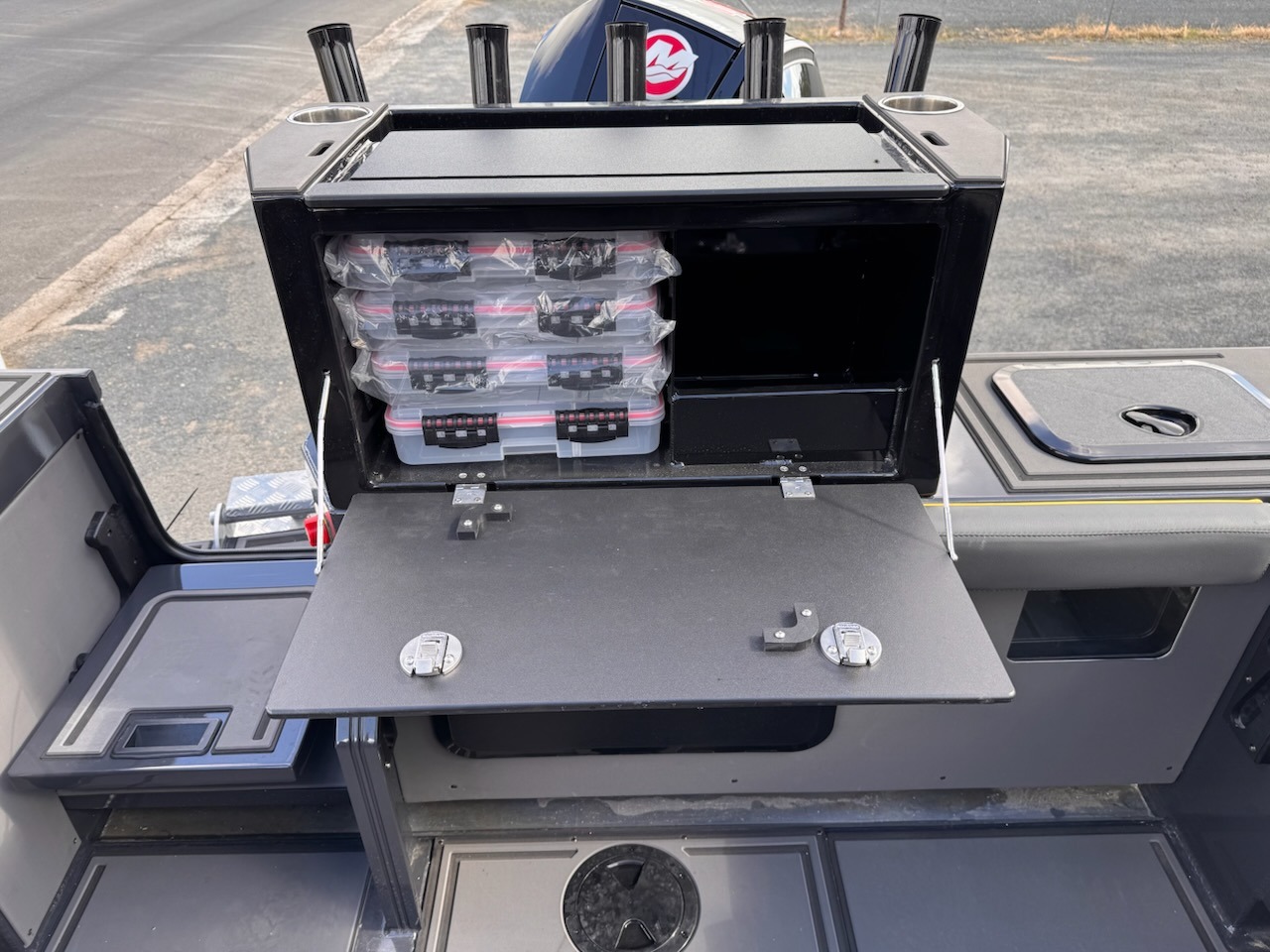 Features a large self-draining rear deck, live bait tank, bait station, and custom rod holders.